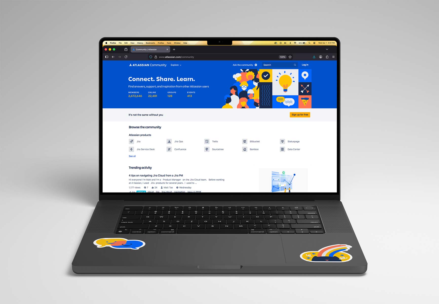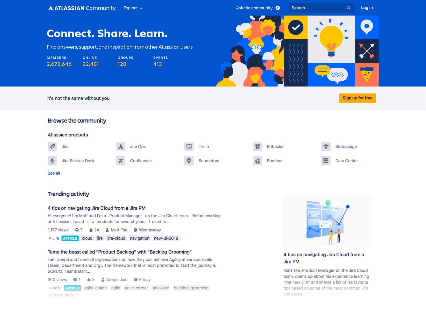 A new visual identity for the Atlassian Community, a global network of over 4.5 million members dedicated to mastering teamwork and Atlassian tools. In addition, community members host regular, free, in-person meetups in more than 180 cities worldwide. With 2 million monthly visitors and over 340 local chapters, the community successfully blends massive online scale with personalized, local connection.